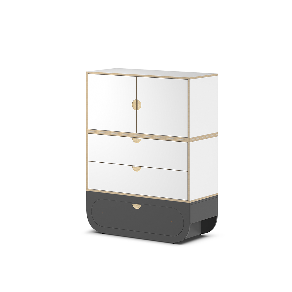 This modular chest of drawers, built on the Base Short with drawer, combines a drawer module and a closed cabinet, offering a complete storage system to maintain visual order and cleanliness in the space. Its vertical design is ideal for small rooms, maximizing storage without taking up additional floor area.