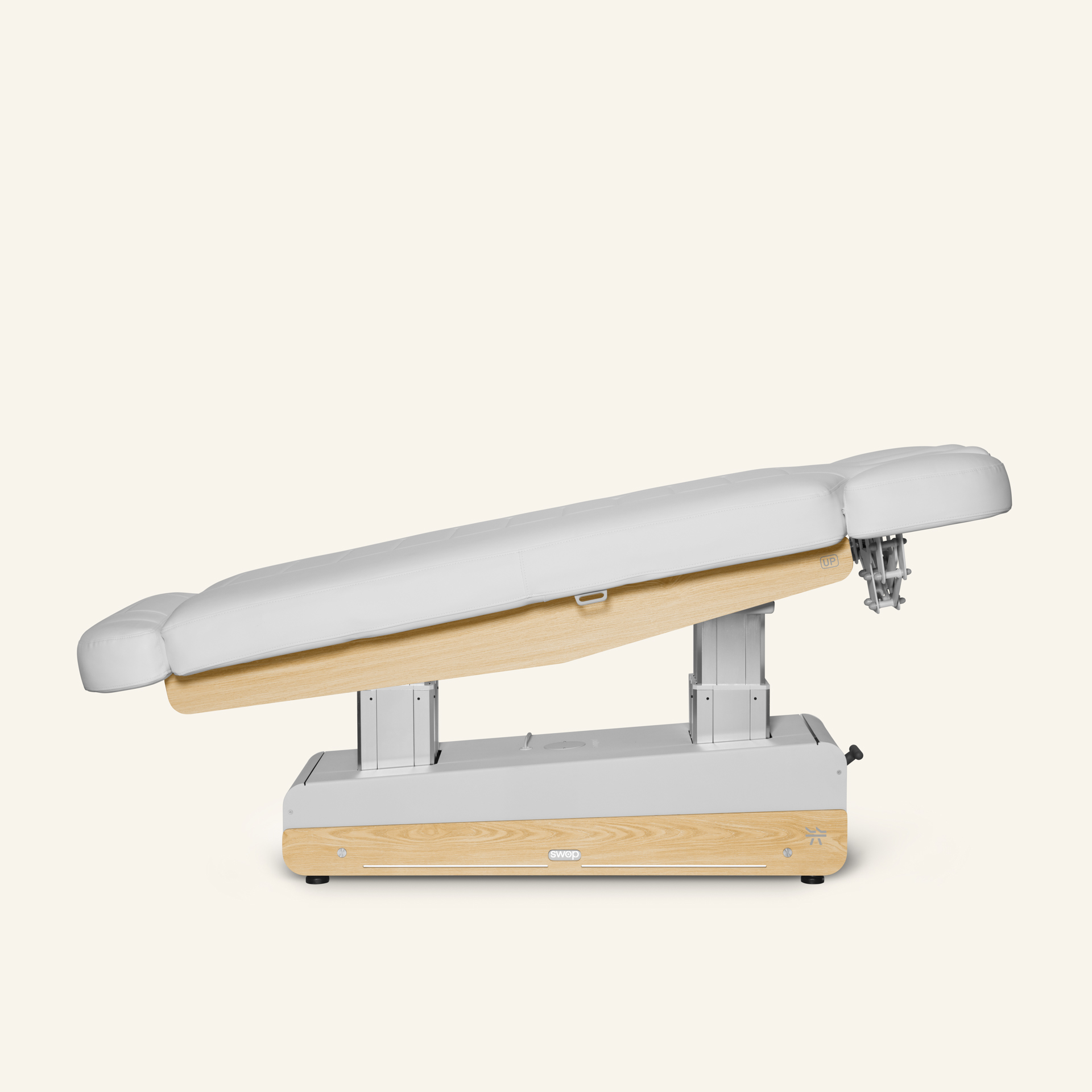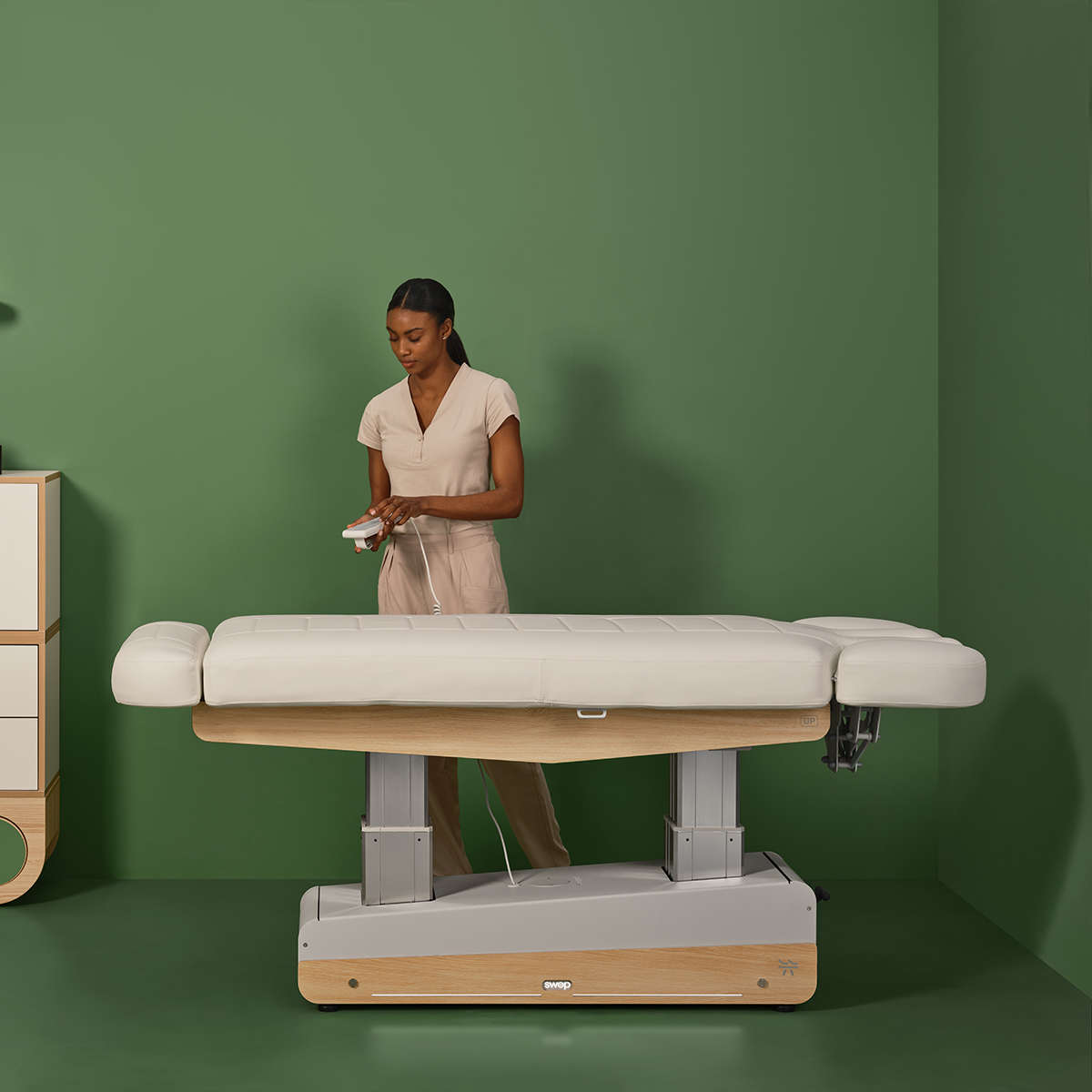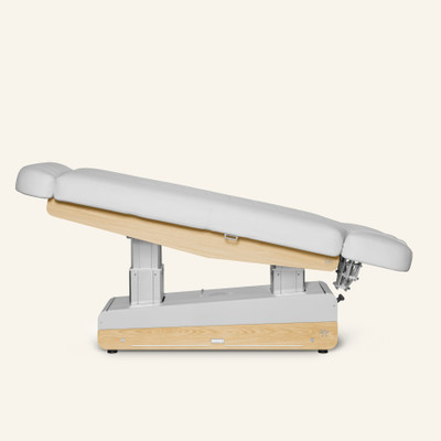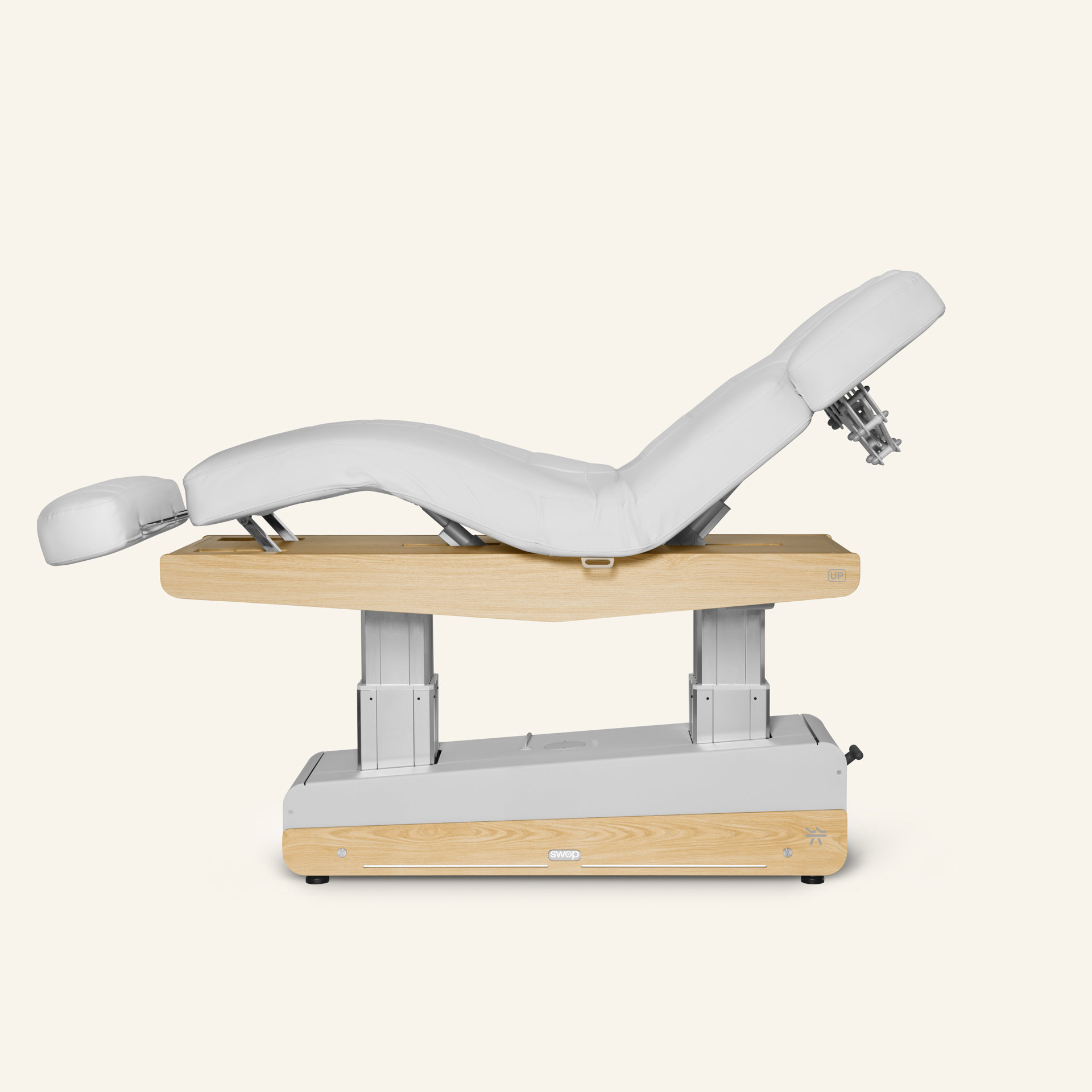 Electric 4-motor treatment table with a dual-column structure, enabling advanced positions such as Trendelenburg. Optimized for treatment efficiency, it features position memory, integrated heating, and adjustable armrests for superior patient comfort.