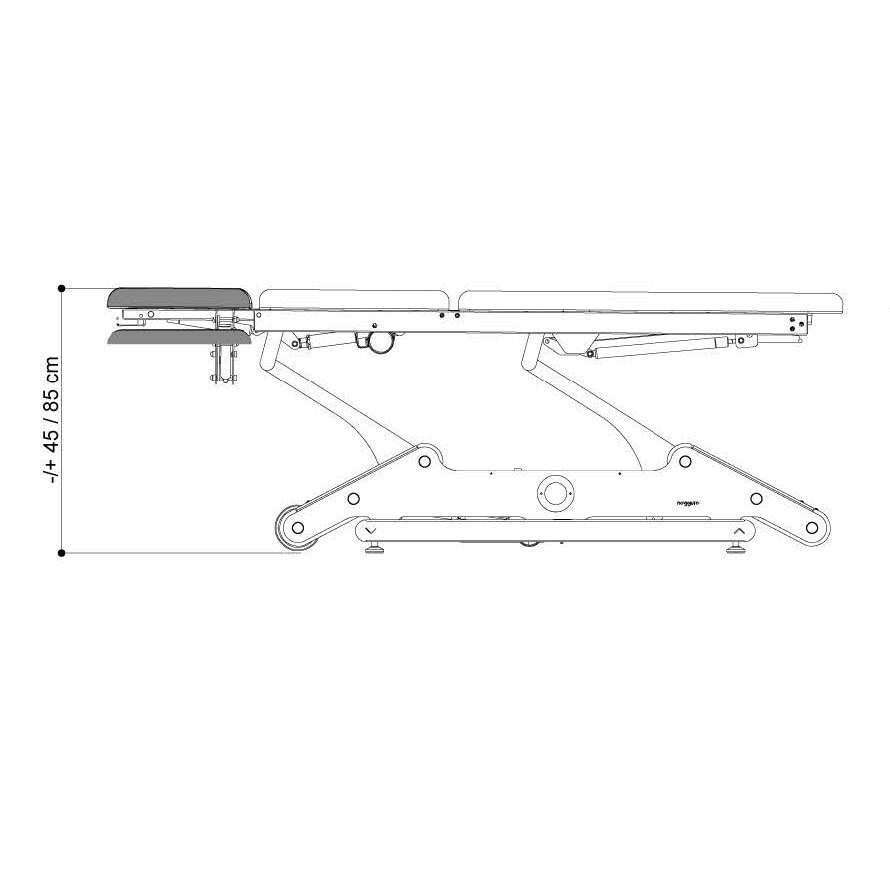 Twinlift three-part headrest: patented armrests with gas-piston adjustment that allow the patient to move them smoothly to the right height. No fixed positions, and no interference with the therapist when seated at the head end.