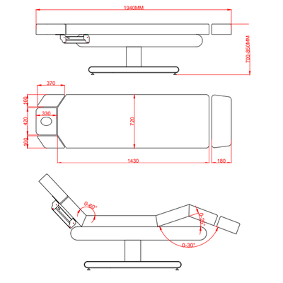 This professional SPA table is equipped with three electric motors that allow smooth and precise adjustment of the height, backrest inclination, and footrest.