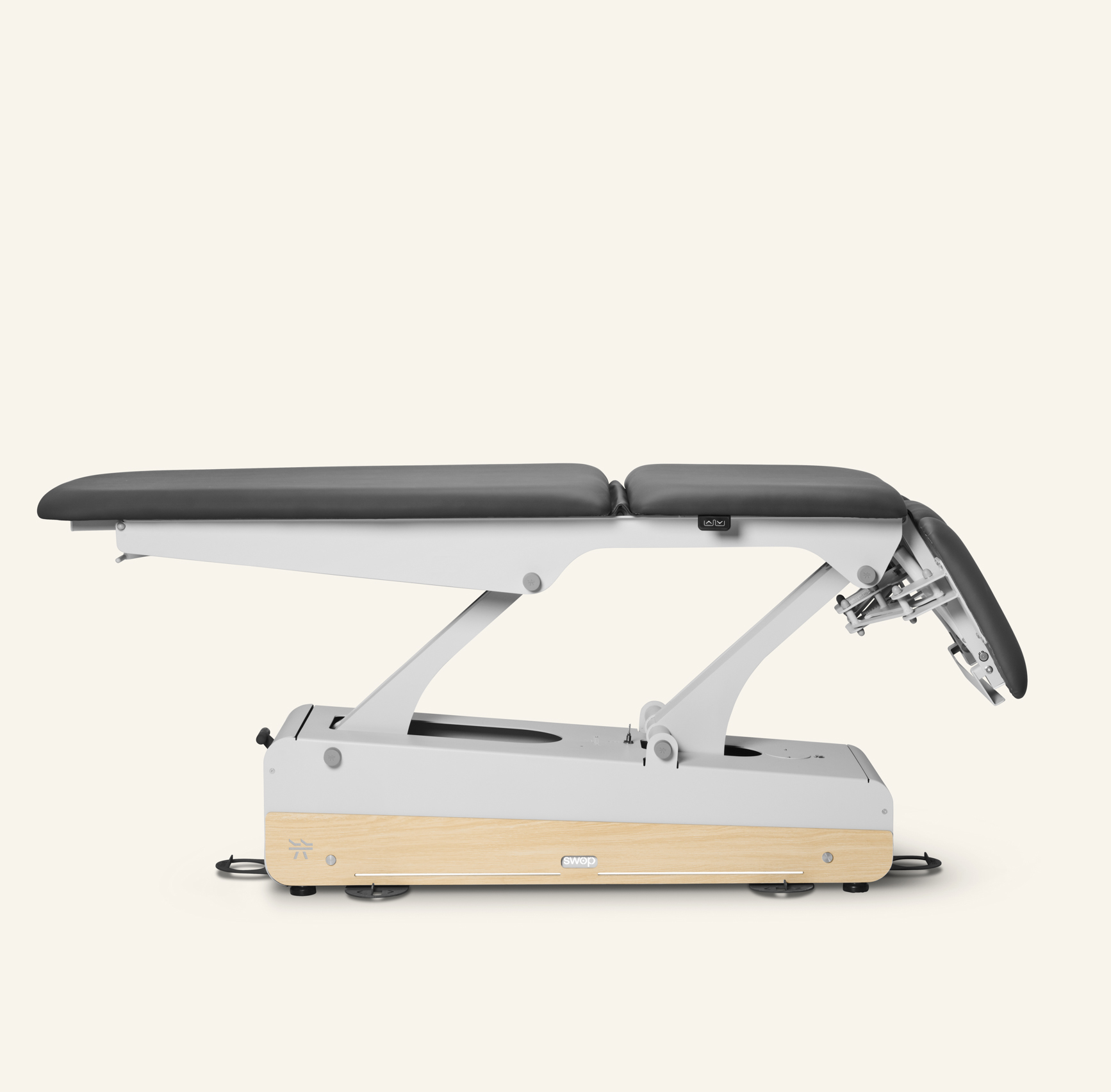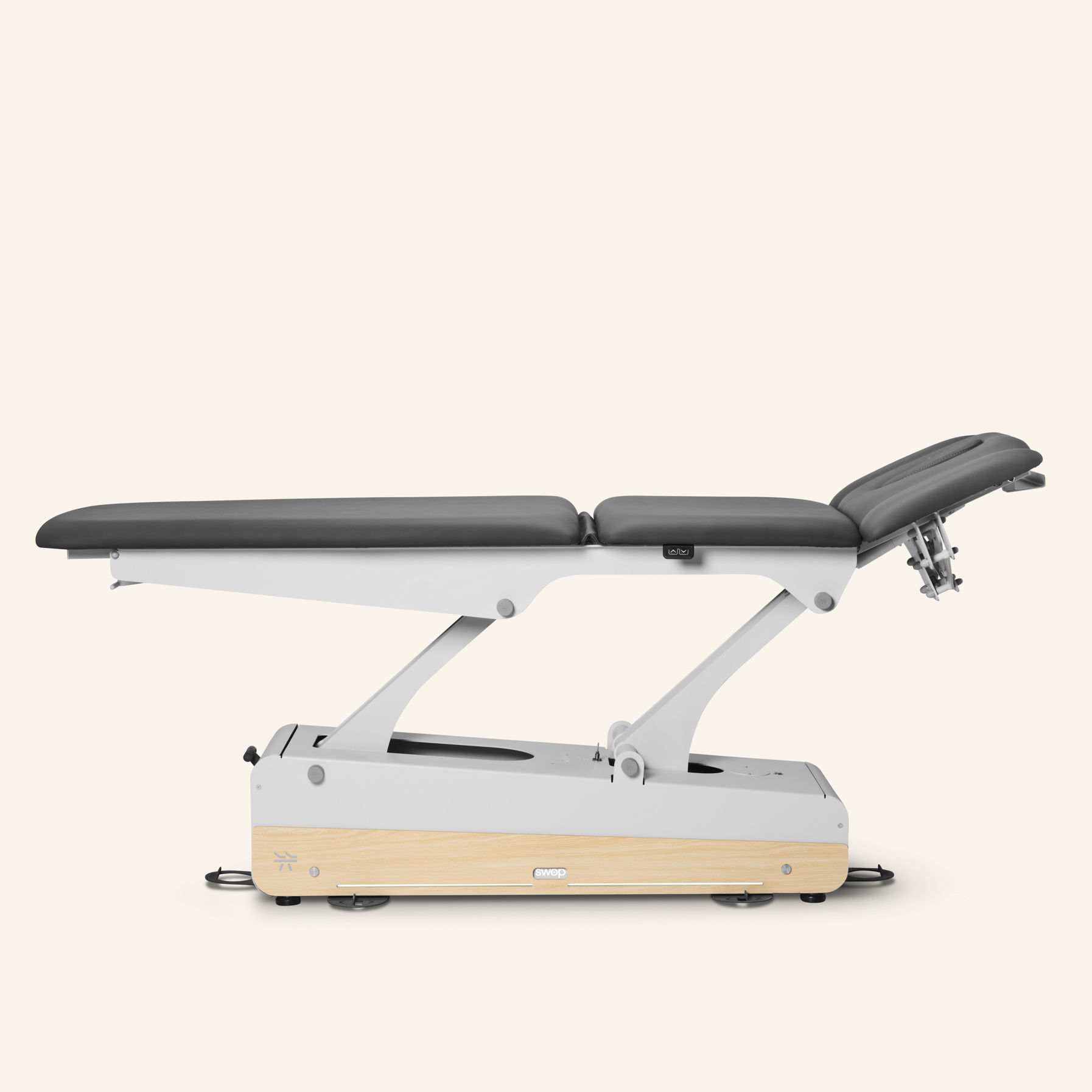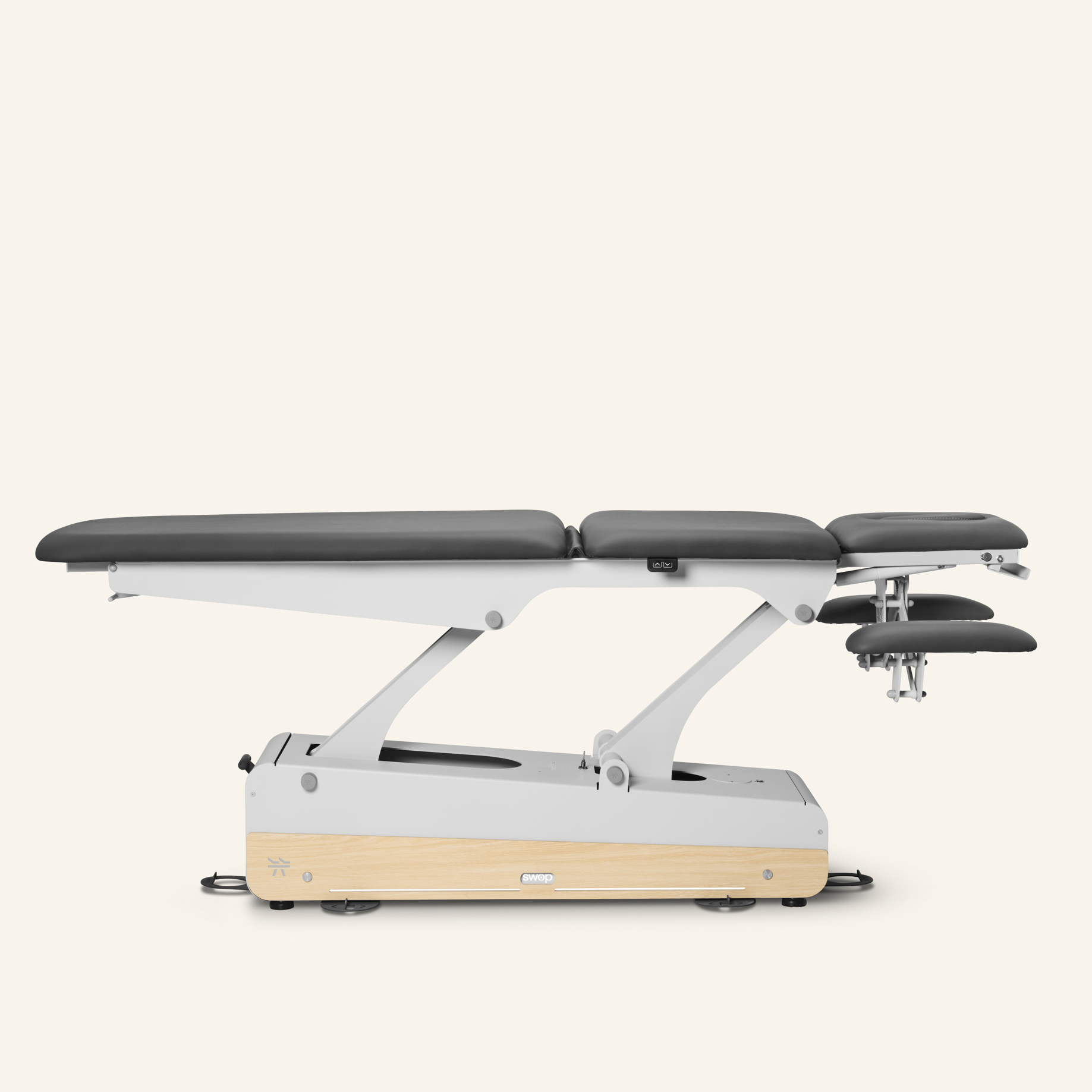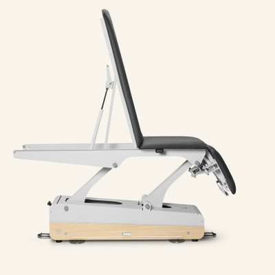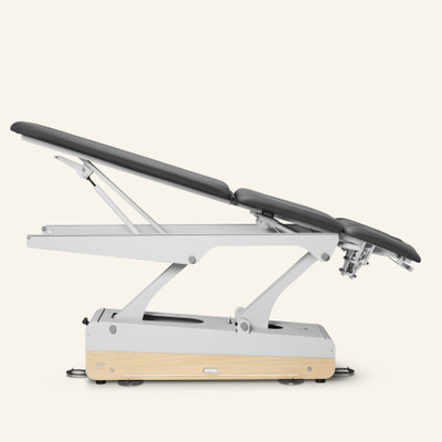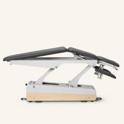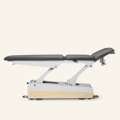 Premium electric 5-section treatment table with 2 motors: one for height adjustment and one for the central lift. For enhanced comfort, it comes with integrated heating and adjustable headrest arm supports.