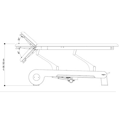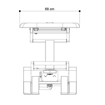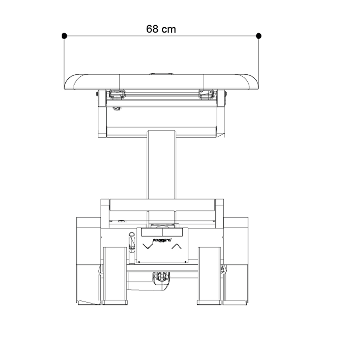 4 pyörää (360° kääntyvät), täysin integroitu jalustarakenteeseen. 2 vivulla pöytä voidaan nostaa pyörien varaan liikuttamista varten.