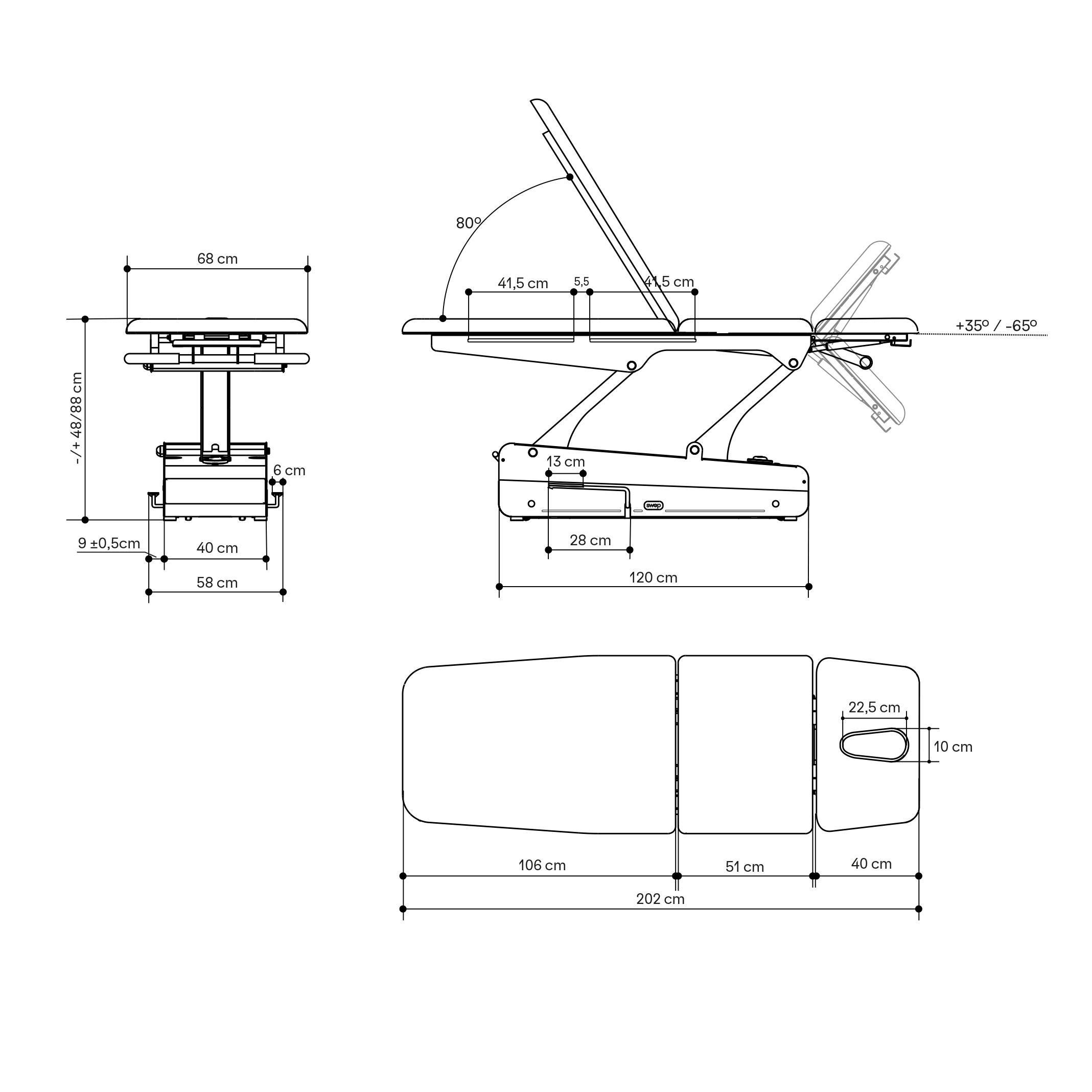 Useita asentoja ja maksimoi potilaan mukavuuden kasvopehmusteen, käsituen ja 360° lukittavien pyörien avulla.