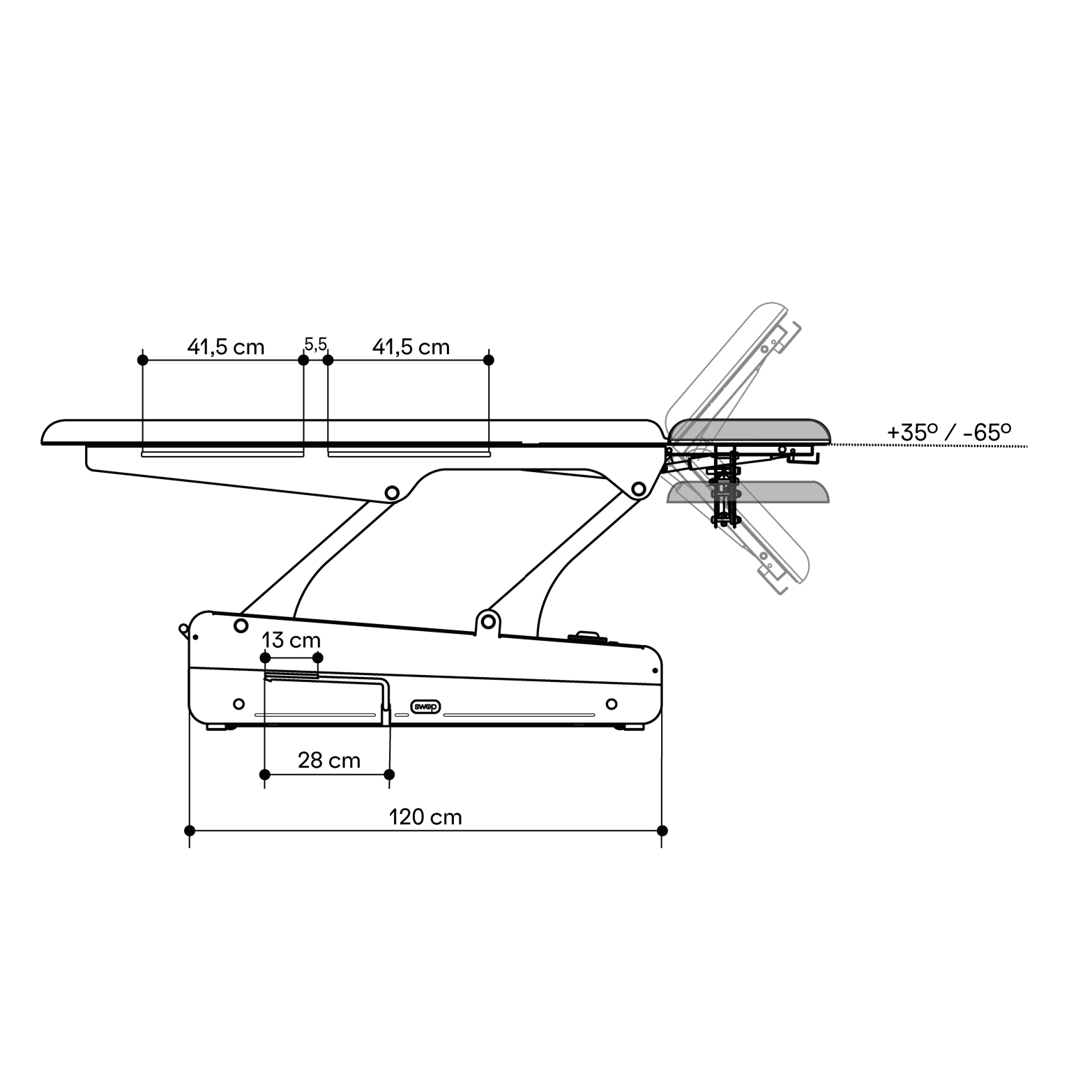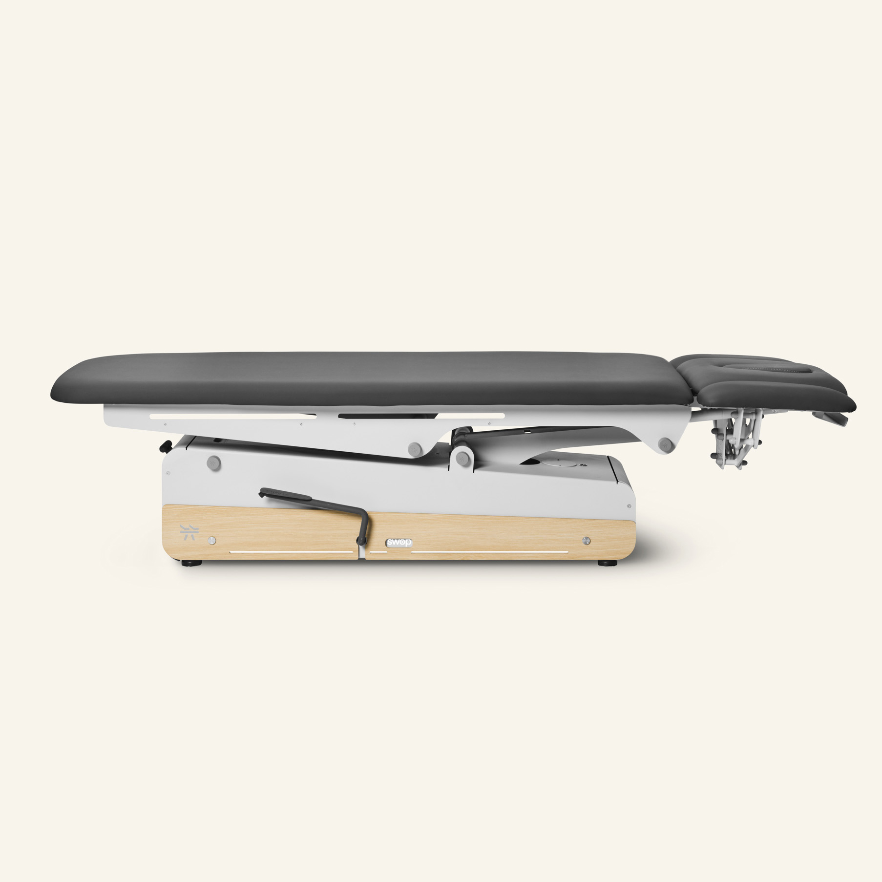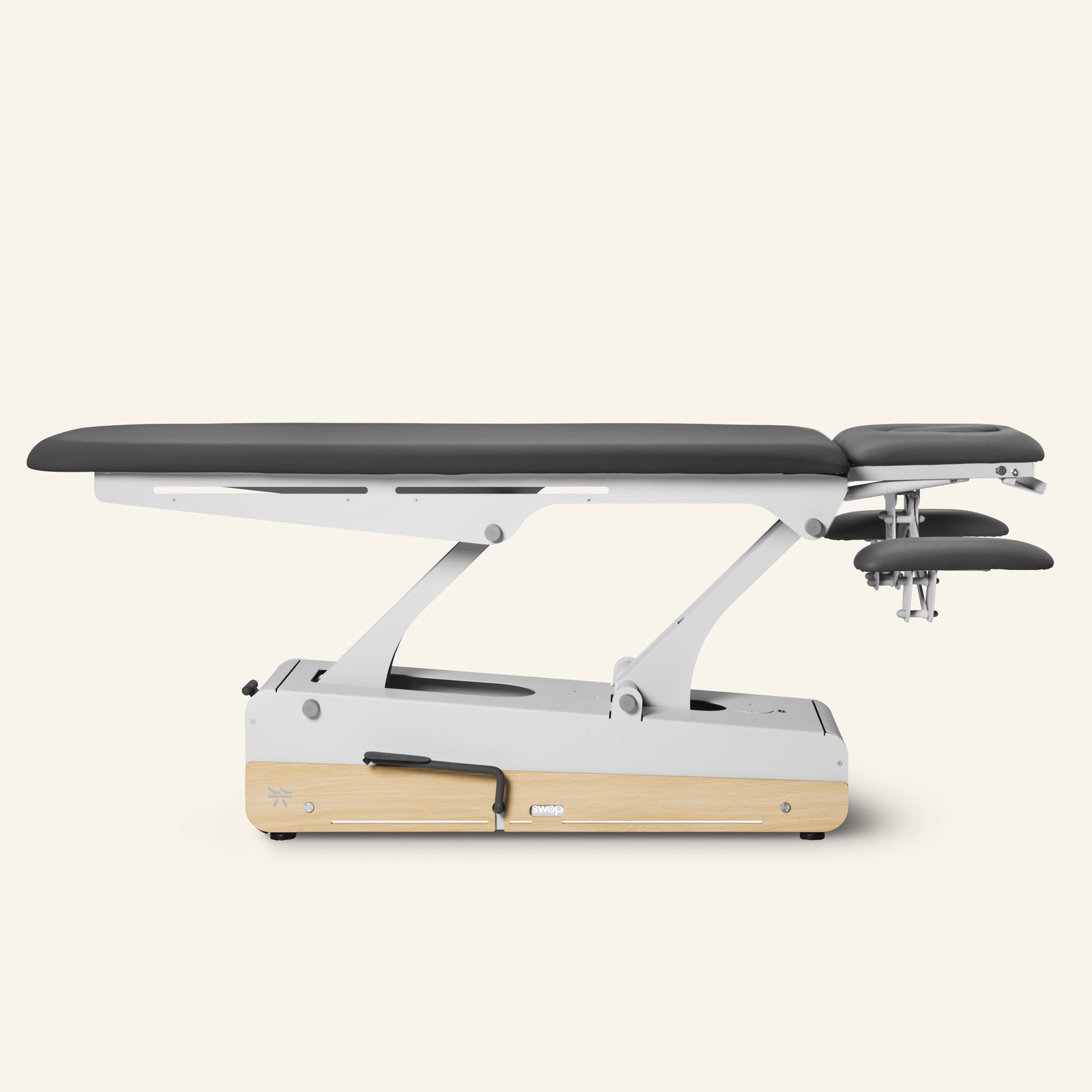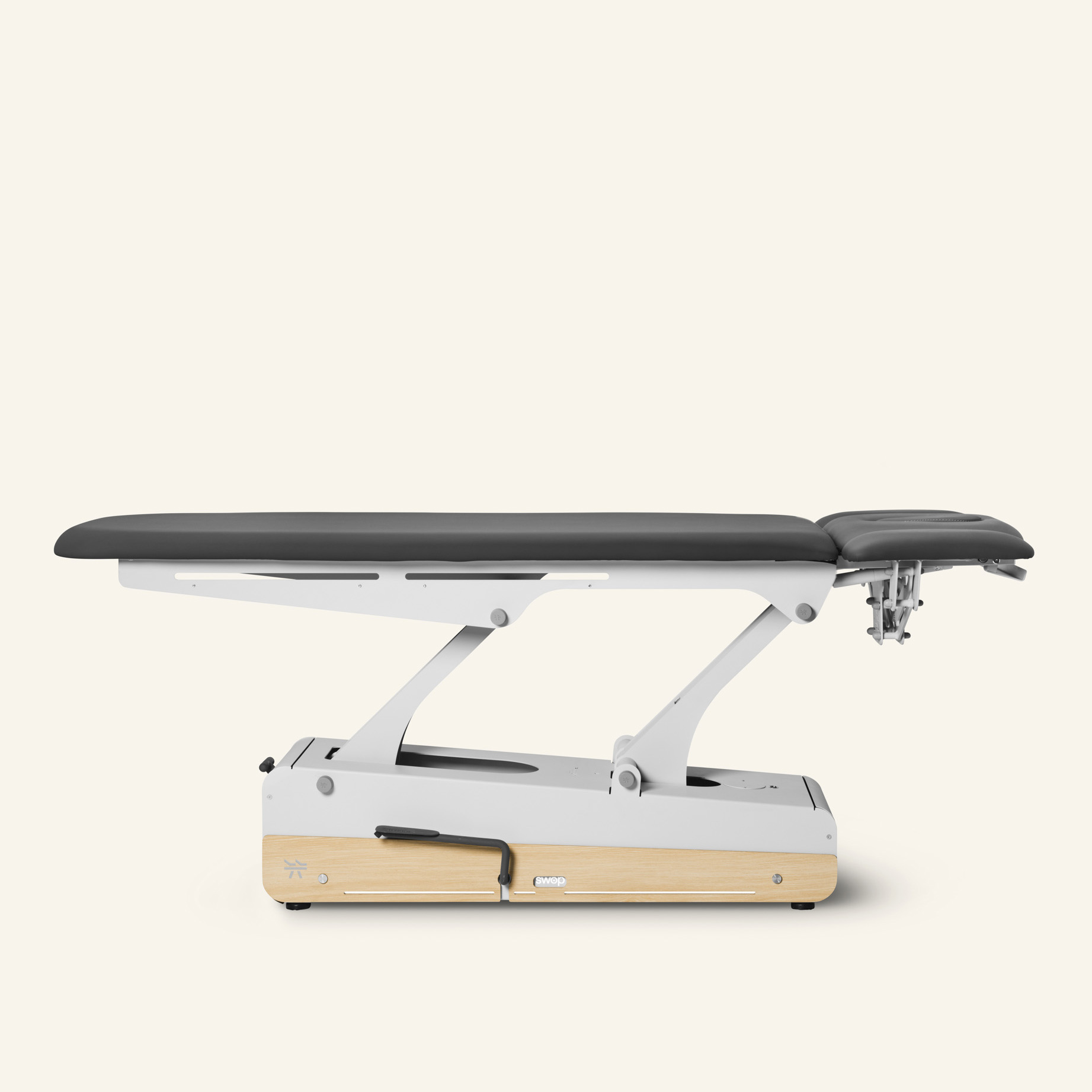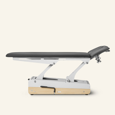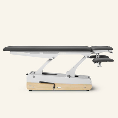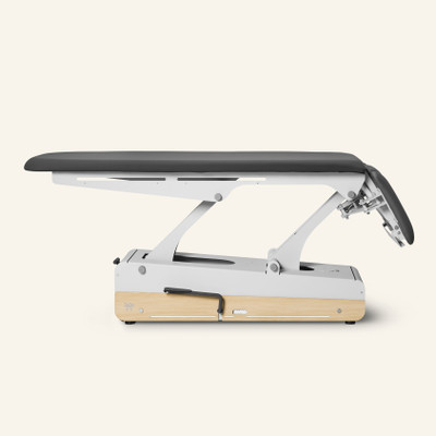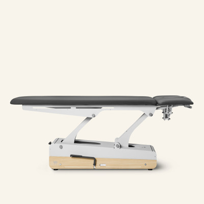 4-osainen hydraulinen hoitopöytä lyhyellä pääosalla, jota voi säätää sekä positiivisiin että negatiivisiin kulmiin. Mukavuuden lisäämiseksi pöydässä on korkeussäädettävät käsinojat ja 360° kääntyvät pyörät.