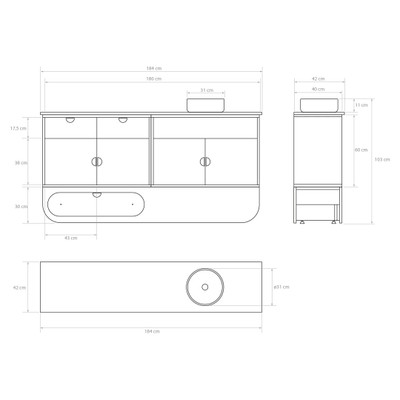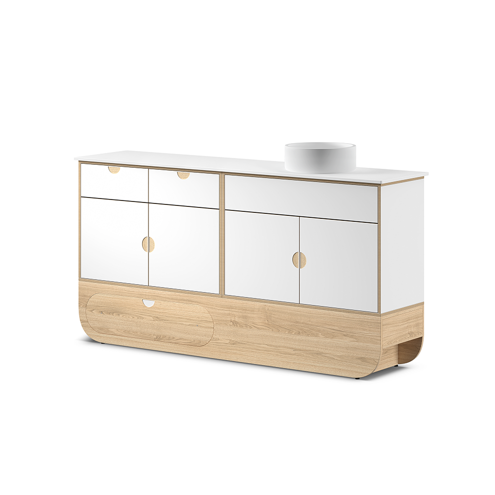 Suunniteltu tuomaan tilavat, toiminnalliset ja tehokkaat vesialueet kylpyhuoneisiin, keittiöihin tai hoitotiloihin ja tarjoamaan suuren työskentelypinnan. Moduuli koostuu pitkästä tammiviimeistellystä jalustasta, kahdesta kaapistosta laatikoilla, keraamisesta altaasta sekä korkealaatuisesta teknisestä kvartsitasosta, joka on huokoseton ja helposti puhdistettava – ihanteellinen ratkaisu terveys- ja hyvinvointialan vaatimien korkeiden hygieniastandardien ylläpitämiseen. Tekninen melamiinipinta ja vesitiiviit reunat suojaavat kalustetta kosteudelta ja takaavat erinomaisen kestävyyden myös intensiivisessä käytössä.