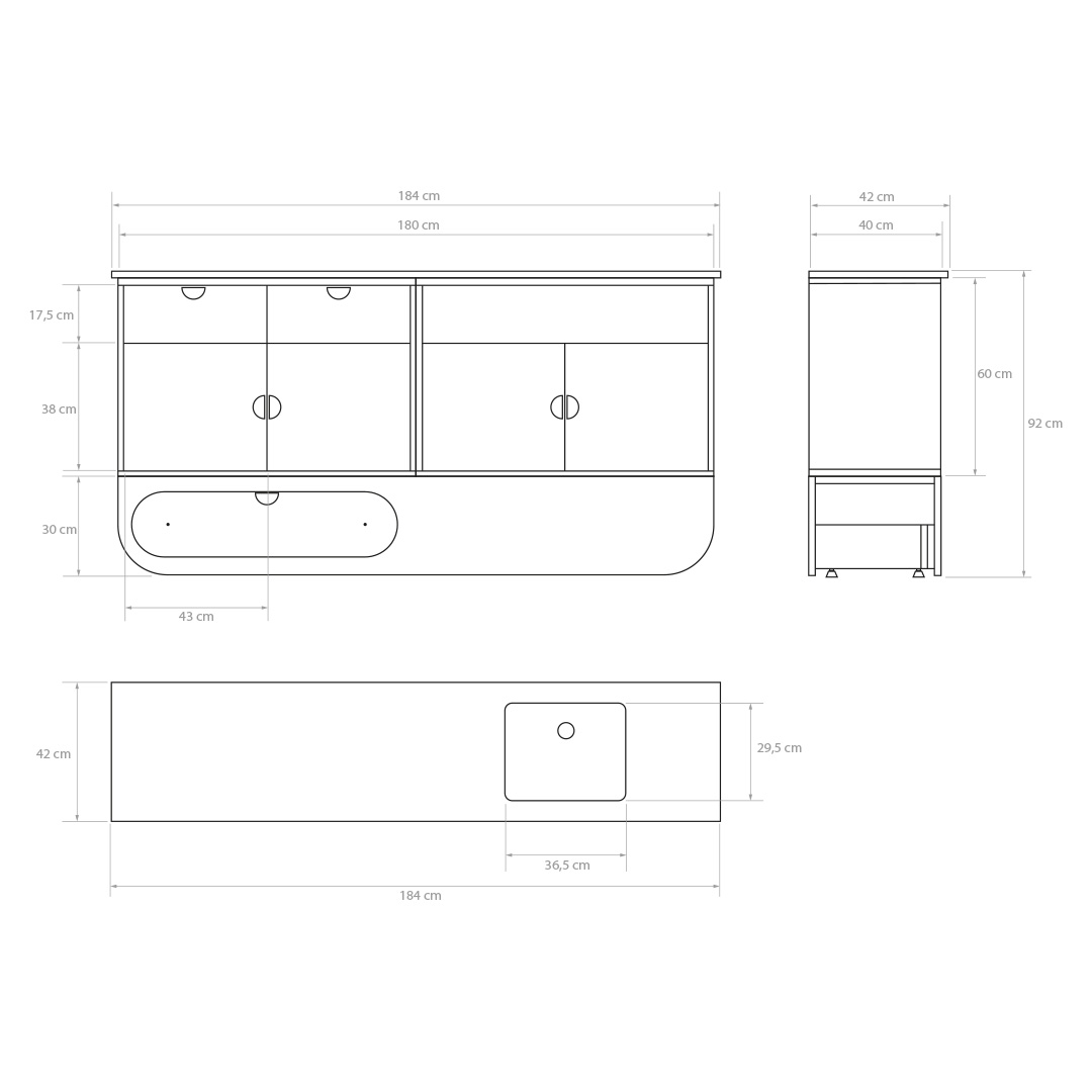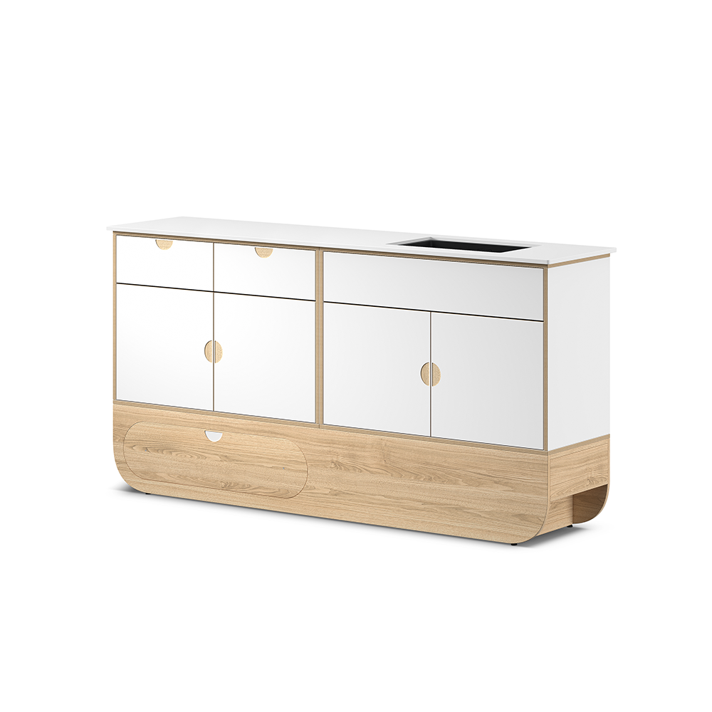 Suunniteltu tuomaan tilavat, toiminnalliset ja tehokkaat vesipisteet kylpyhuoneisiin, keittiöihin tai hoitotiloihin, ja tarjoamaan suuren työskentelypinnan. Moduuli koostuu tammiviimeistellystä pitkästä jalustasta, kahdesta kaapista laatikoilla, mustasta ruostumattomasta teräksestä valmistetusta altaasta sekä korkealaatuisesta teknisestä kvartsitasosta, joka on huokoseton ja helposti puhdistettava – ihanteellinen ratkaisu korkeita hygieniastandardeja vaativiin ympäristöihin. Tekninen melamiinipinta ja vesitiiviit reunat suojaavat kosteudelta ja takaavat erinomaisen kestävyyden myös intensiivisessä käytössä.