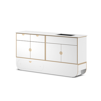 Tämä hygieniamoduuli, joka on rakennettu Large Base -jalustalle, maksimoi työtilan yhdistämällä suuren kvartsityötason ja toimivan vesialueen korkealla esteettisellä arvolla.