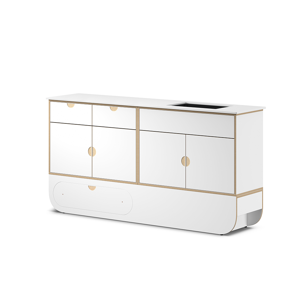 Suunniteltu tuomaan tilavat, toiminnalliset ja tehokkaat vesipisteet kylpyhuoneisiin, keittiöihin tai hoitotiloihin, ja tarjoamaan suuren työskentelypinnan. Moduuli koostuu pitkästä jalustasta, kahdesta kaapista laatikoilla, mustasta ruostumattomasta teräksestä valmistetusta altaasta sekä korkealaatuisesta teknisestä kvartsitasosta, joka on huokoseton ja helposti puhdistettava – ihanteellinen ratkaisu korkeita hygieniastandardeja vaativiin ympäristöihin. Tekninen melamiinipinta ja vesitiiviit reunat suojaavat kosteudelta ja takaavat erinomaisen kestävyyden myös intensiivisessä käytössä.