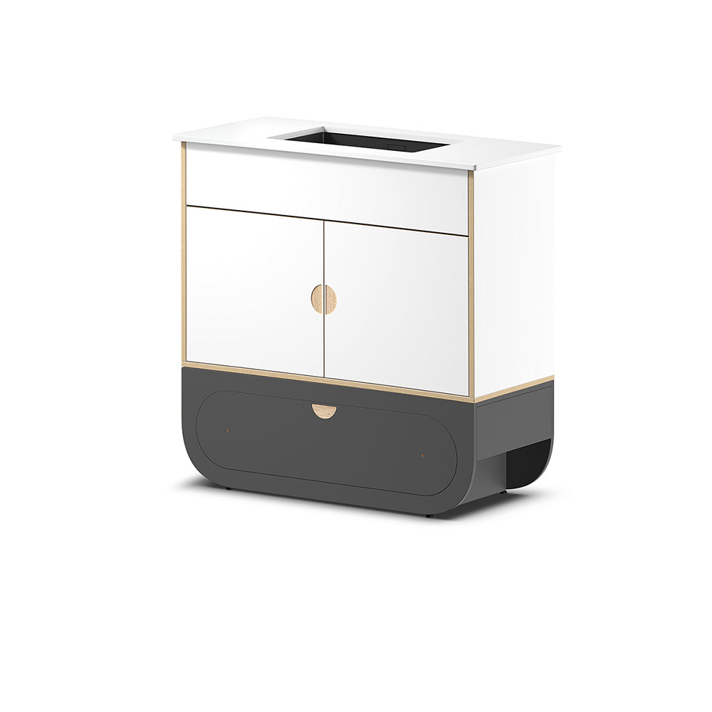 Suunniteltu tuomaan toimivat ja tehokkaat vesipisteet kylpyhuoneisiin, keittiöihin tai hoitotiloihin, joissa tila on rajallinen. Tämä moduuli koostuu lyhyestä jalustasta, säilytyskaapista, mustasta ruostumattomasta teräksestä valmistetusta altaasta sekä korkealaatuisesta kvartsitasosta. Kvartsipinta on huokoseton ja helposti puhdistettava, minkä ansiosta se sopii erinomaisesti ympäristöihin, joissa hygieniavaatimukset ovat erityisen korkeat, kuten terveys- ja wellness-tiloihin. Tekninen melamiinipinta ja vesitiiviit reunat suojaavat kalustetta kosteudelta ja varmistavat sen pitkäikäisyyden myös intensiivisessä käytössä.