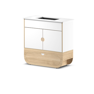 Suunniteltu tuomaan toimivat ja tehokkaat vesipisteet kylpyhuoneisiin, keittiöihin tai hoitotiloihin, joissa tila on rajallinen. Tämä moduuli koostuu tammiviimeistellystä lyhyestä jalustasta, säilytyskaapista, mustasta ruostumattomasta teräksestä valmistetusta altaasta sekä korkealaatuisesta kvartsitasosta. Kvartsipinta on huokoseton ja helposti puhdistettava, minkä ansiosta se sopii erinomaisesti ympäristöihin, joissa hygieniavaatimukset ovat erityisen korkeat, kuten terveys- ja wellness-tiloihin.Tekninen melamiinipinta ja vesitiiviit reunat suojaavat kalustetta kosteudelta ja varmistavat sen pitkäikäisyyden myös intensiivisessä käytössä.