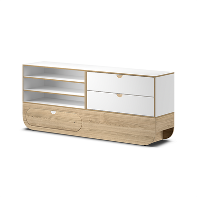 Tämä säilytyskaluste on suunniteltu klinikoille, vastaanotoille, hoitokeskuksiin ja muihin tiloihin, joissa tarvitaan tehokkaita ja monipuolisia järjestelmäratkaisuja. Pitkä tammenvärinen pohja yhdistyy hyllyyn ja laatikkomoduuliin muodostaen toiminnallisen ja tyylikkään kokonaisuuden, joka tarjoaa sekä työskentelytilaa että käytännöllistä säilytystä.