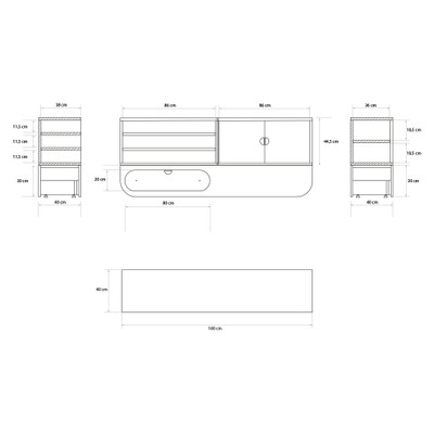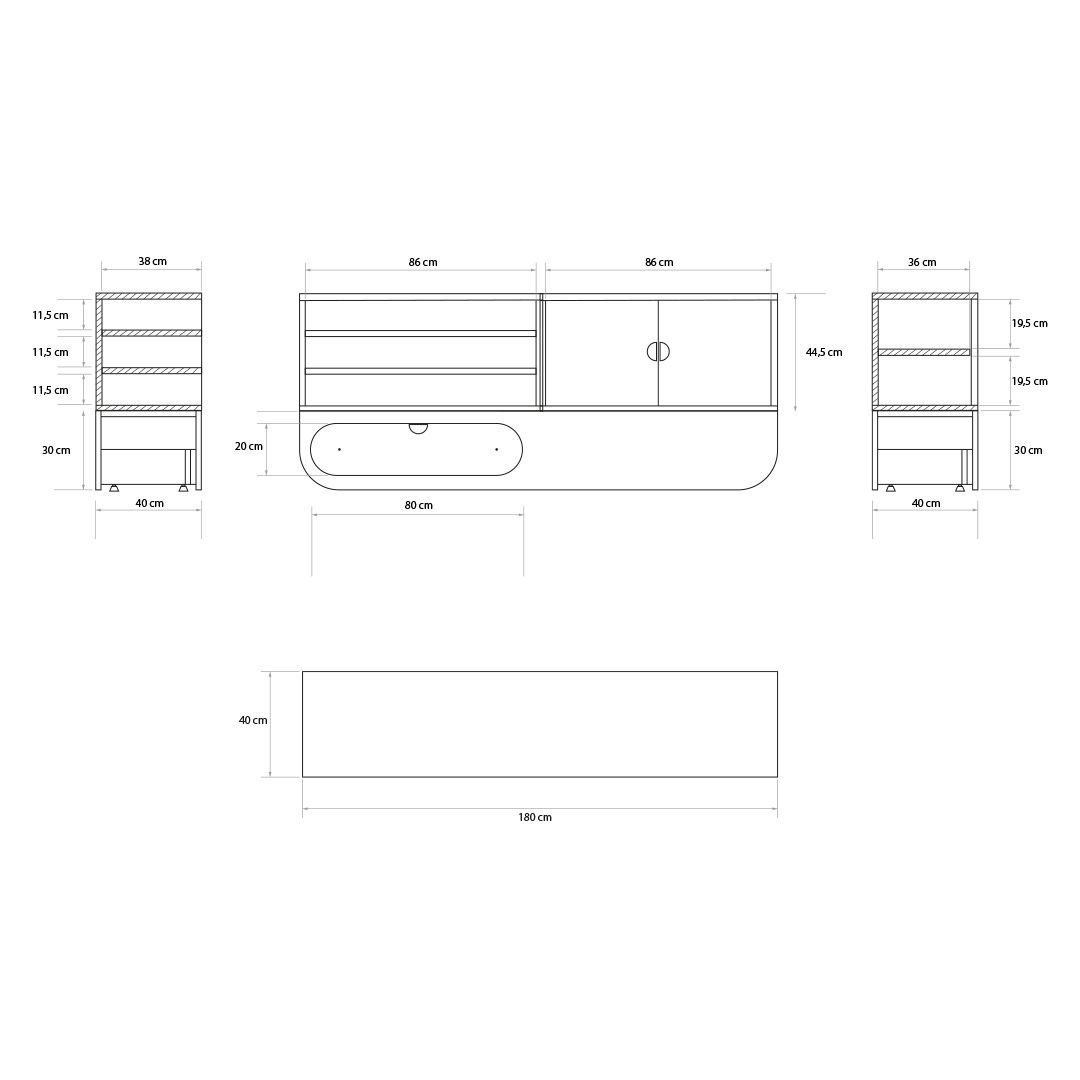 Tämä 180 × 40 × 74,5 cm kokoinen modulaarinen sivutaso, joka on koottu Large Base -alustalle laatikolla, sisältää säilytysmoduuleja ja laajan tason, joka sopii erinomaisesti sekä työskentelyyn että välineiden säilyttämiseen. Sen monipuolinen muotoilu mukautuu erilaisiin tarpeisiin ja tarjoaa järjestelmällisen ja tehokkaan tilan.