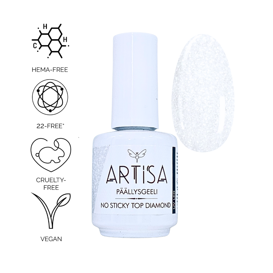 ARTISA No Sticky Top Diamond on korkealaatuinen päällysgeeli, joka luo kestävän ja kirkkaan lopputuloksen timanttimaisella kiillolla. Tahmaamaton koostumus takaa täydellisen viimeistelyn ja pitkäkestoisen kiillon. Sopii ammattilaisille ja kotiin.