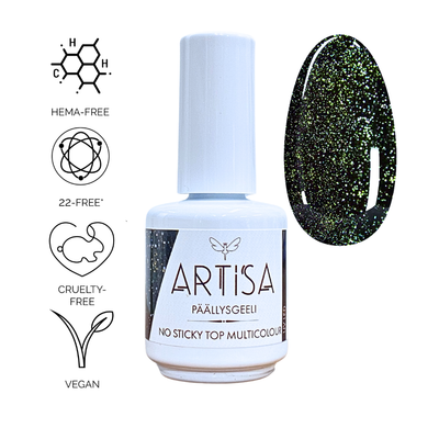 ARTISA No Sticky Top Multicolour on korkealaatuinen päällysgeeli, joka luo kestävän, kirkkaan ja monivärisen lopputuloksen ilman tahmaavaa kerrosta. Ammattilaistason geeli sopii kaikenlaiseen manikyyriin, tarjoten pitkäkestoisen kiillon ja kauniin viimeistelyn.